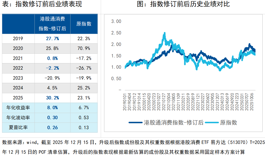 根据修订后的指数成份股进行回测,自2019年以来,修订后的港股通消费指数年化收益率更高、年化波动率更低,夏普比率也更高。2019-2025年的7年间,有4年相比原指数有超额收益,在2021、2022等年份也表现出了更强的抗跌属性。