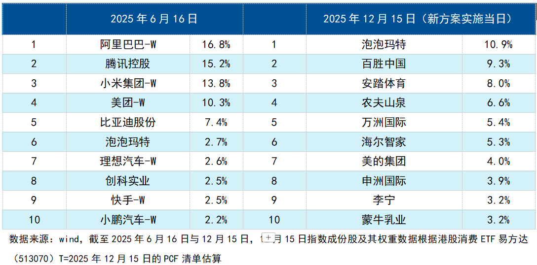 从前十大成份股来看,也更加集中于真正的消费龙头。如下图所示,阿里巴巴-W(09988.HK)、腾讯控股(00700.HK)等一些科技公司被剔除,一些更贴近大家认知的消费品公司如泡泡玛特(09992.HK)、百胜中国(09987.HK)、安踏等的占比显著提高,进入了前十大,指数变得更加“纯粹”。