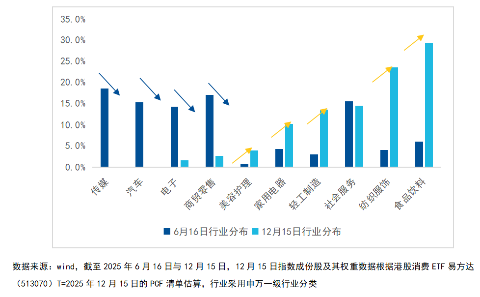 从调整后的行业分布来看,“真消费”行业板块权重显著提升,业务模糊或科技属性更强的行业被剔除。如下图所示,食品饮料、纺织服饰、家用电器、美容护理等行业占比抬升,而传媒、汽车等行业被剔除,电子、商贸零售行业的占比明显下降。