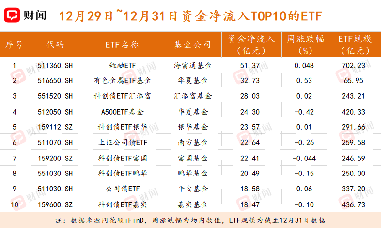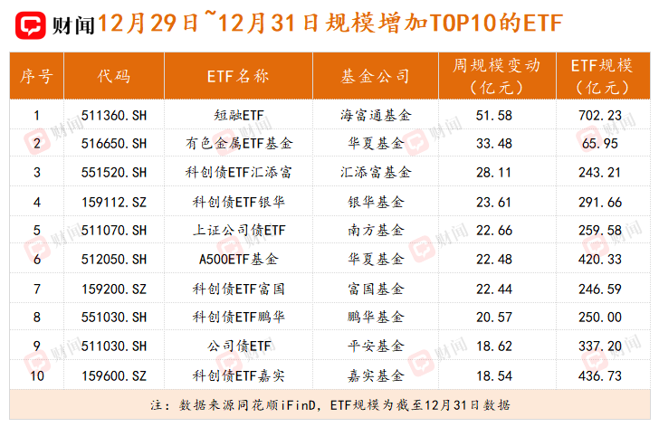 在上周小热点爆发,大行情缺乏的情况下,资金的流向成为决定基金规模的关键变量。受益于强劲的资金流入,短融ETF(511360.SH)规模单周激增51.58亿元,截至12月31日达702.23亿元。这是继11月20日首次突破700亿元后,该产品规模第二次站上这一关口。