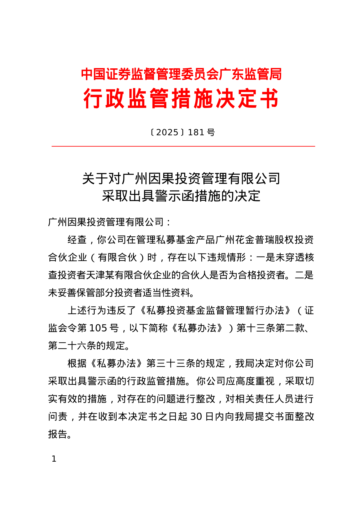 上述行为违反了《私募投资基金监督管理暂行办法》的规定。广东证监局决定对广州因果投资管理有限公司采取出具警示函的行政监管措施。