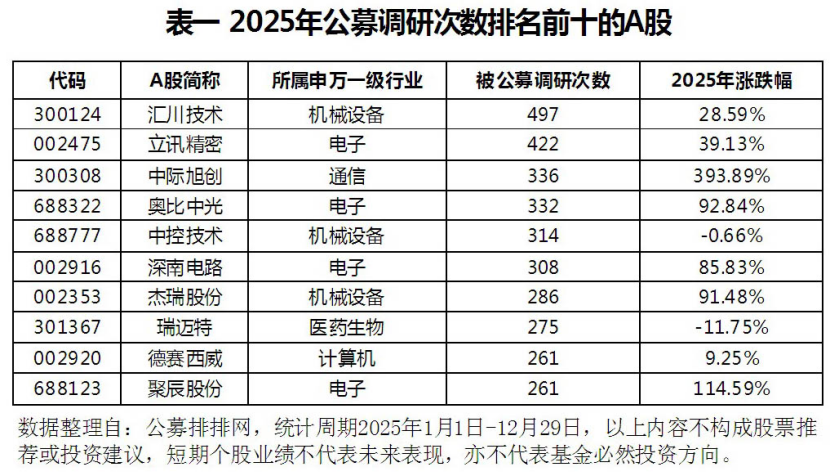 记者注意到,在公募调研次数排名前十的个股中不乏2025年涨幅不菲的个股,如中际旭创(300308)全年大涨393.89%,聚辰股份全年上涨114.59%;但也有涨幅平平的个股,如居调研榜前两位的汇川技术和立讯精密分别上涨28.59%和39.13%,而分别排在调研榜第五和第八位的中控技术和瑞迈特(301367)两只个股则全年下跌,跌幅分别为0.66%和11.75%(详见表一)。
