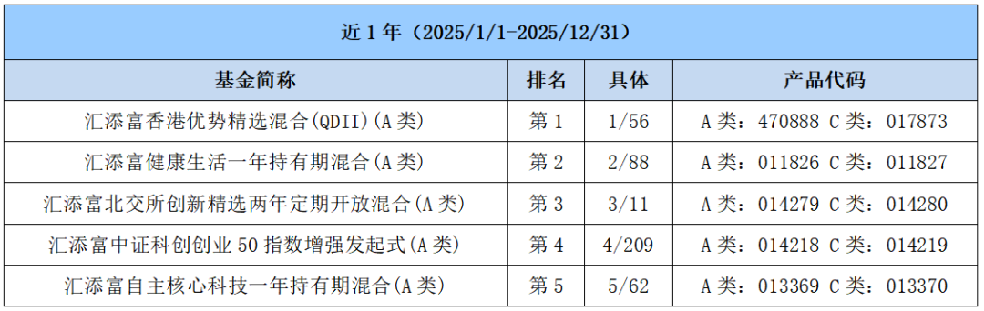 排名数据来自银河证券基金研究中心发布的中国公募基金长期业绩榜单,基金类别按照银河证券三级分类,截至2025/12/31。汇添富香港优势精选混合(QDII)(A类)、汇添富全球移动互联灵活配置混合(QDII)(A类)、汇添富全球消费行业混合(QDII)(A类)属于QDII混合基金(A类);汇添富自主核心科技一年持有期混合(A类)属于TMT与信息技术行业偏股型基金(A类);汇添富北交所创新精选两年定期开放混合(A类)属于北交所主题偏股型基金(A类);汇添富ESG可持续成长股票(A类)、汇添富中国高端制造股票(A类)属于标准股票型基金(A类);汇添富优选回报灵活配置混合(C类)、汇添富达欣灵活配置混合(C类)属于灵活配置型基金(基准股票比例30%-60%)(非A类);汇添富科技创新灵活配置混合(A类)、汇添富策略增长灵活配置混合属于灵活配置型基金(基准股票比例60%-100%)(A类);汇添富品牌力一年持有期混合(A类)、汇添富优势企业精选混合(A类)、汇添富数字未来混合(A类)、汇添富民营活力混合属于偏股型基金(股票上下限60%-95%)(A类);汇添富数字经济核心产业一年持有期混合(D类)属于偏股型基金(股票上下限60%-95%)(非A类);汇添富消费行业混合属于消费行业偏股型基金(A类);汇添富健康生活一年持有期混合(A类)、汇添富医疗服务灵活配置混合(A类)属于医药医疗健康行业偏股型基金(A类);汇添富中证科创创业50指数增强发起式(A类)、汇添富国证2000指数增强(A类)、汇添富中证芯片产业指数增强发起式(A类)属于增强规模指数股票型基金(A类)。
