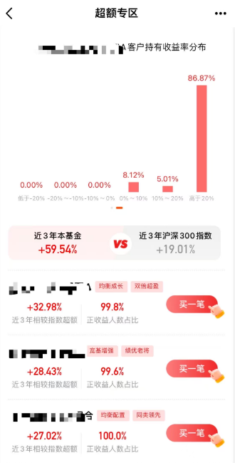 例如,天天基金上线了超额专区,基于基准占比、指数相关性、超额收益、运作稳定性、投研支持这五大维度,筛选具备持续超额收益潜力的产品。并且,这一专区突出了投资者的真实盈利情况,直观呈现持仓用户盈利占比与平均收益率,将产品的价值与投资者获得感直接挂钩。