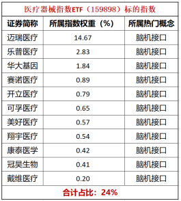值得注意的是,近期脑机接口概念持续火爆,医疗器械指数ETF(159898)标的指数中“脑机接口概念”含量约24%。目前A股完全意义上的脑机接口标的较为稀缺,或可借道捕捉产业创新机遇。