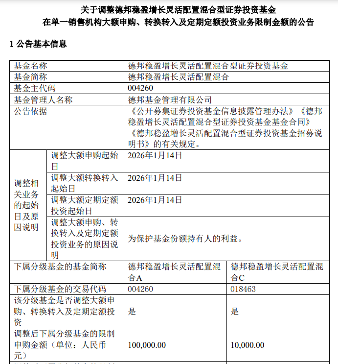 1月13日下午,德邦基金发布公告称,感谢对公司旗下基金的持续关注。考虑到基金申购的资金流入可能对基金的收益率产生稀释效应,基于“持有人利益优先”的核心原则,为切实保护全体基金份额持有人的合法权益,维护基金资产的稳健运作,公司审慎研究后决定,自1月14日起进一步下调该基金A类、C类份额的申购限额,将原单日申购上限1000万元、100万元,分别调整为10万元、1万元。