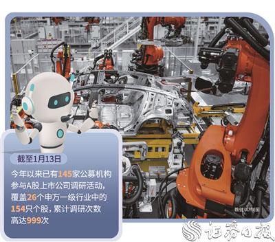 公募排排网最新数据显示,截至1月13日,今年以来已有145家公募机构参与A股上市公司调研活动,覆盖26个申万一级行业中的154只个股,累计调研次数高达999次。