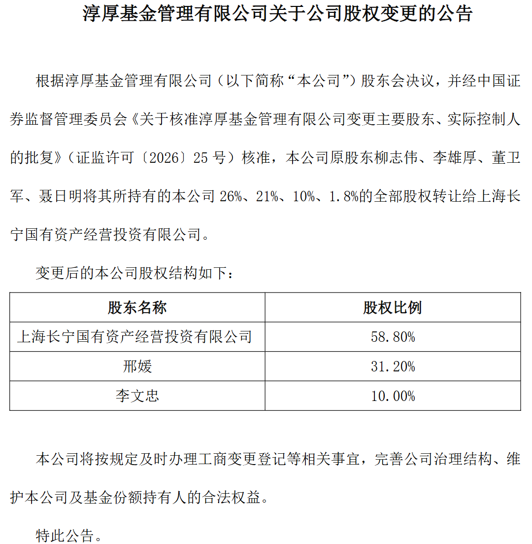 近日,淳厚基金发布股权变更公告称,根据公司股东会决议,并经证监会《关于核准淳厚基金管理有限公司变更主要股东、实际控制人的批复》核准,公司原股东柳志伟、李雄厚、董卫军、聂日明将其所持有的本公司26%、21%、10%、1.8%的全部股权转让给上海长宁国有资产经营投资有限公司(下称“长宁国投”)。