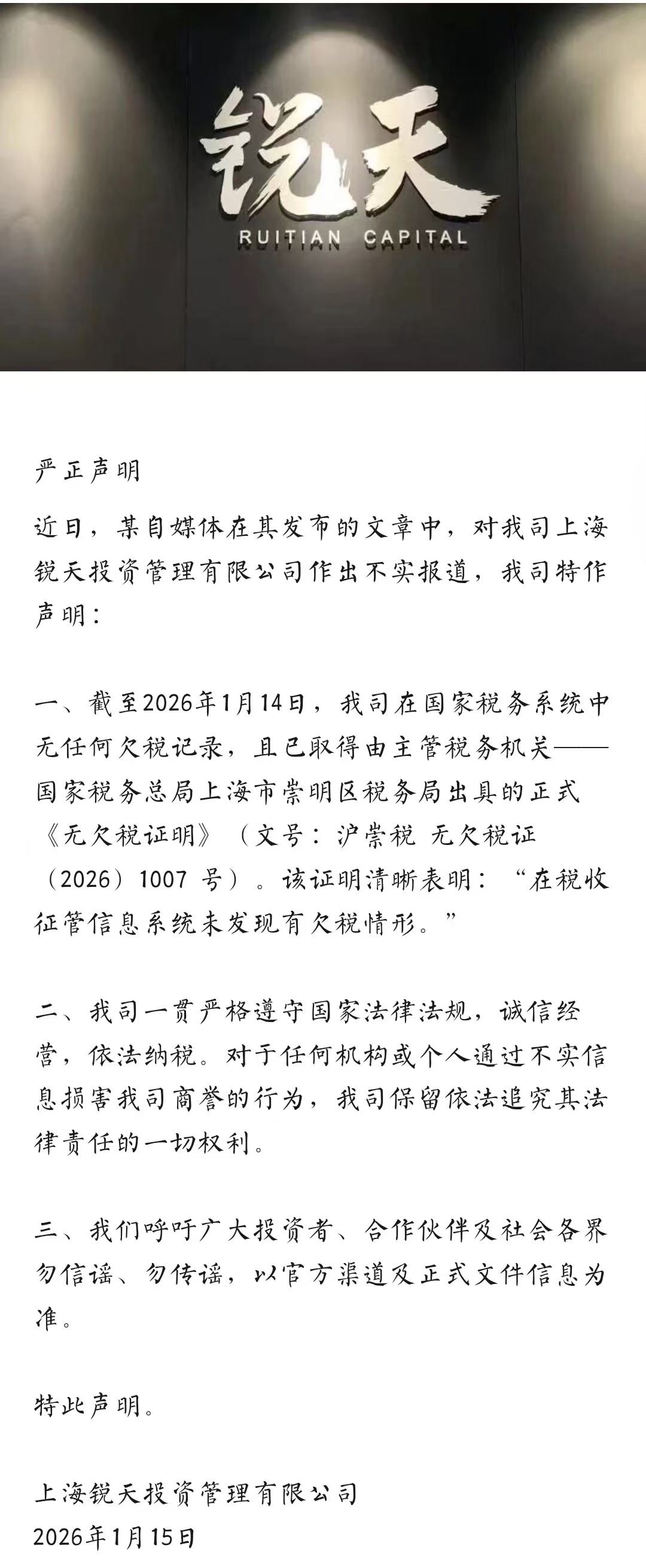 锐天投资声明中提到,截至2026年1月14日,公司在国家税务系统中无任何欠税记录,且已取得由主管税务机关——国家税务总局上海市崇明区税务局出具的正式《无欠税证明》(文号:沪崇税无欠税证(2026)1007号)。该证明清晰表明:“在税收征管信息系统未发现有欠税情形。”