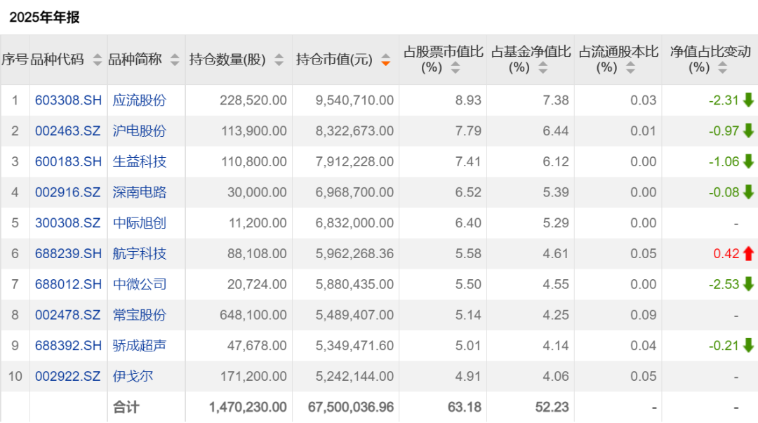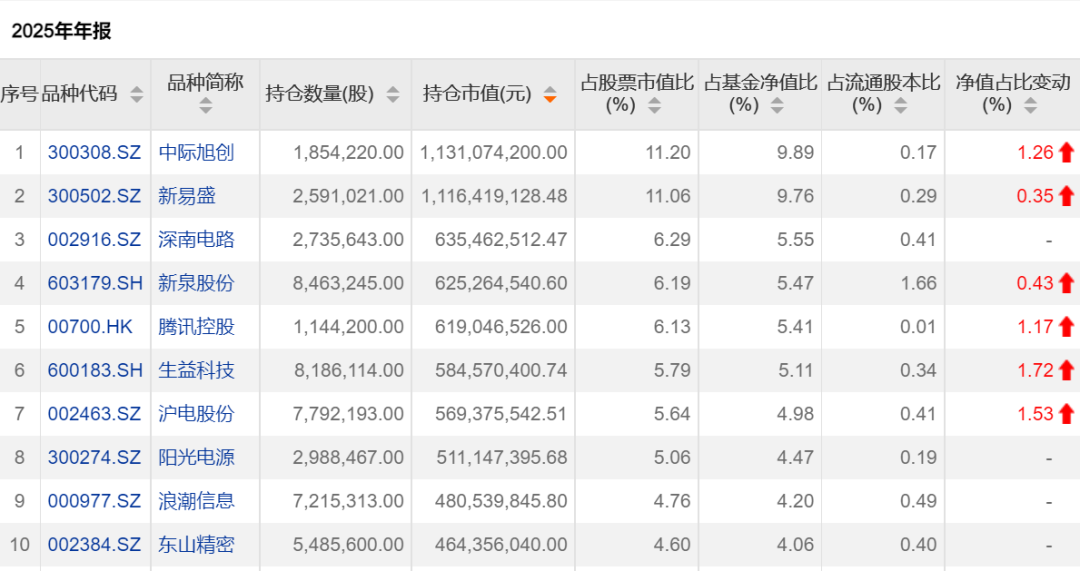 具体来看,中欧数字经济混合基金2025年收益超过140%。截至2025年底,中欧数字经济混合基金的权益投资占基金资产净值比例为88.24%,前十大重仓股同样发生较大变化。截至2025年底,深南电路(002916)、阳光电源(300274)、浪潮信息(000977)、东山精密(002384)新进为中欧数字经济混合基金前十大重仓股。