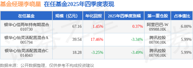 李晓星2025年四季度表现,银华心佳两年持有期混合基金季度涨幅0.37%