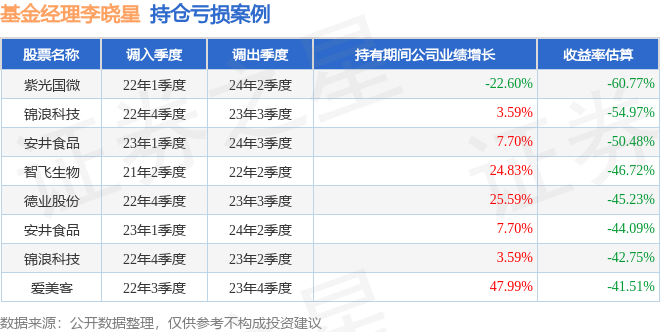 李晓星管理的银华丰享一年持有期混合基金在22年1季度买入紫光国微(002049),在持有2年又1个季度后在24年2季度卖出。持有期间的估算收益率为-60.77%,持有期间紫光国微在2022年到2024年的年报营业总收入降幅为22.6%。