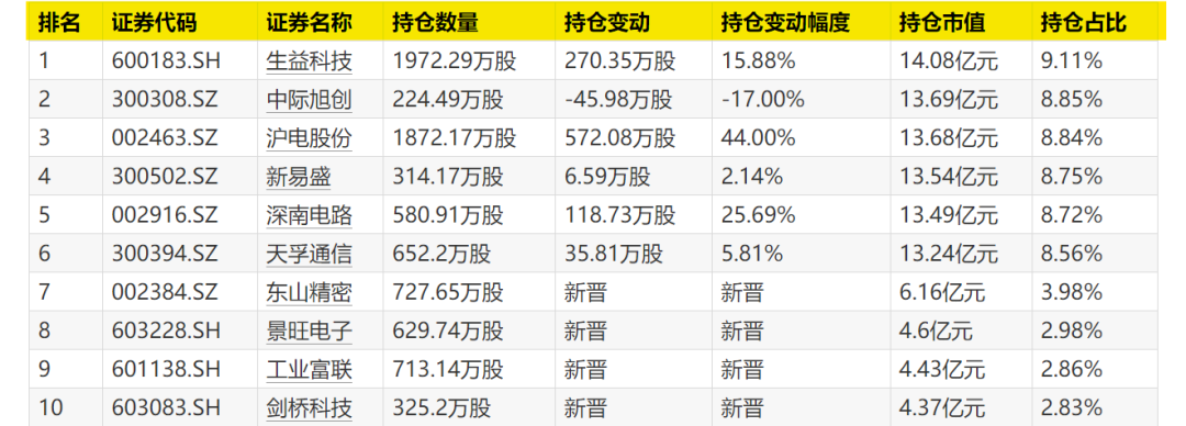 东山精密(002384)、景旺电子(603228)、工业富联(601138)、剑桥科技(603083)新晋十大重仓股。
