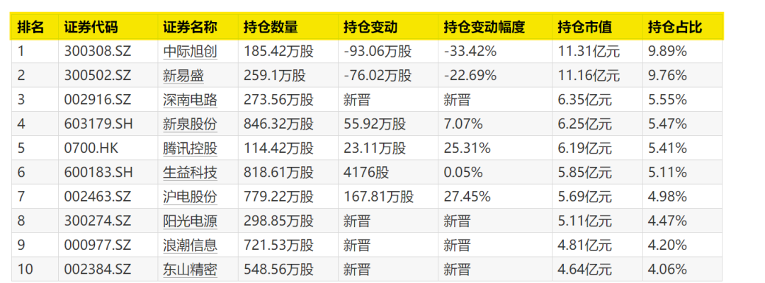 深南电路、阳光电源(300274)、浪潮信息(000977)、东山精密新晋十大重仓股之列。