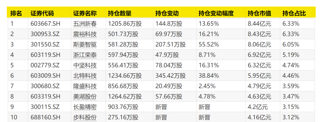 具体来看,前三大重仓股为五洲新春(603667)、震裕科技(300953)、斯菱智驱(301550),持仓市值均在8亿元以上。与三季度相比,北特科技(603009)、斯菱智驱、五洲新春、中坚科技(002779)、震裕科技、美湖股份(603319)、浙江荣泰(603119)、隆盛科技(300680)获加仓,其中,北特科技、斯菱智驱加仓幅度较大,分别为38.84%、55.52%。长盈精密(300115)、步科股份新晋十大重仓股,持仓市值均超4亿元。