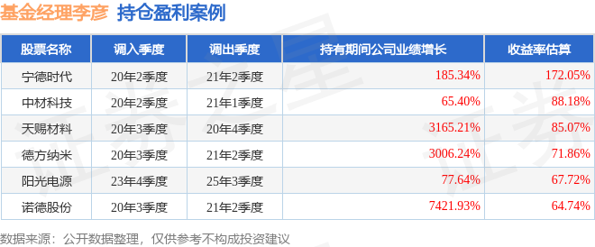 李彦管理的华夏兴和混合A基金在20年2季度买入宁德时代(300750),在持有1年又0个季度后在21年2季度卖出。持有期间的估算收益率为172.05%,持有期间宁德时代在2020年到2021年的年报归属净利润增幅达185.34%。