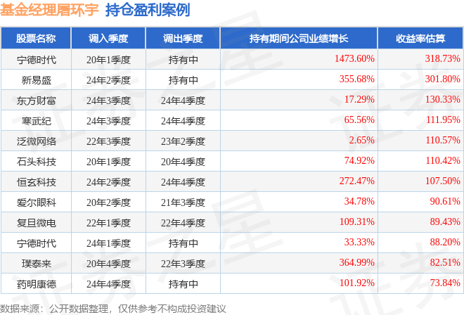 屠环宇管理的华夏创新前沿股票A基金在20年1季度买入宁德时代(300750),已连续持有5年又3个季度。持有期间的估算收益率为318.73%,持有期间宁德时代在2020年到2025年的中报归属净利润增幅达1473.6%。
