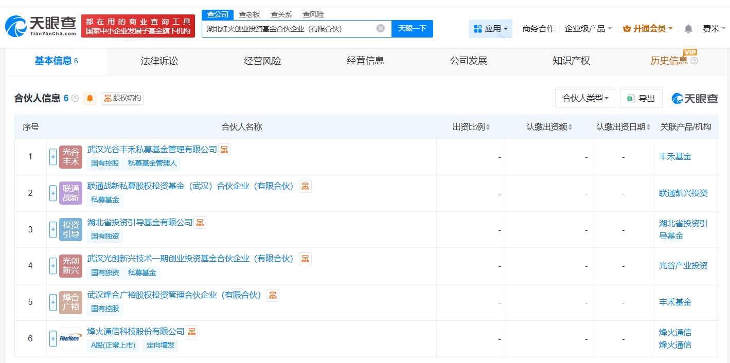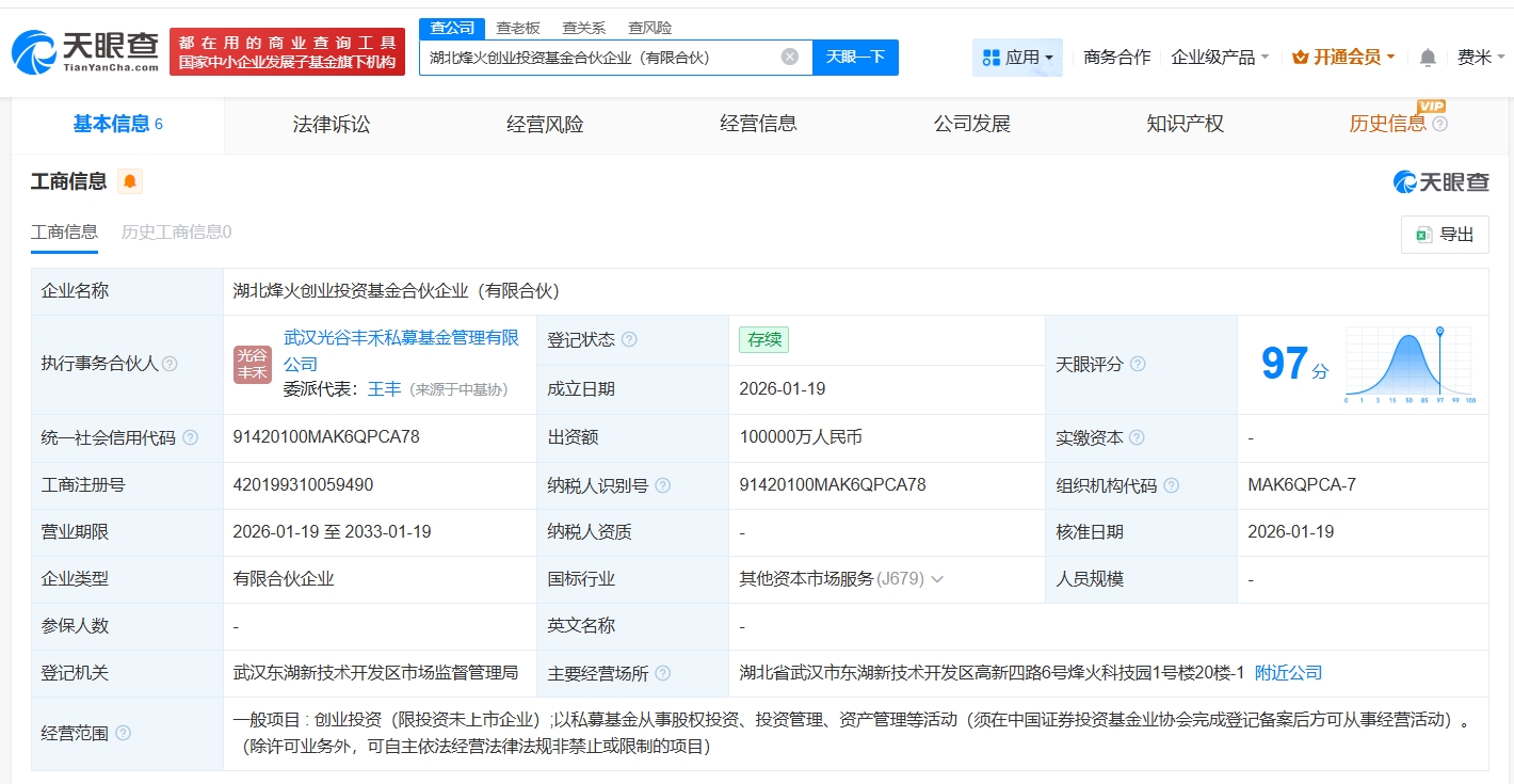 每经AI快讯,天眼查工商信息显示,近日,湖北烽火创业投资基金合伙企业(有限合伙)成立,执行事务合伙人为武汉光谷丰禾私募基金管理有限公司,出资额10亿元人民币,经营范围为创业投资,以私募基金从事股权投资、投资管理、资产管理等活动,由烽火通信(600498)、中国联通(600050)旗下联通战新私募股权投资基金(武汉)合伙企业(有限合伙)、湖北省投资引导基金有限公司等共同出资。