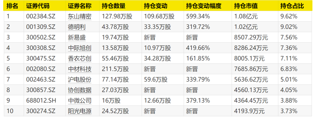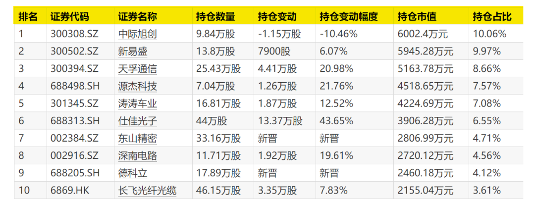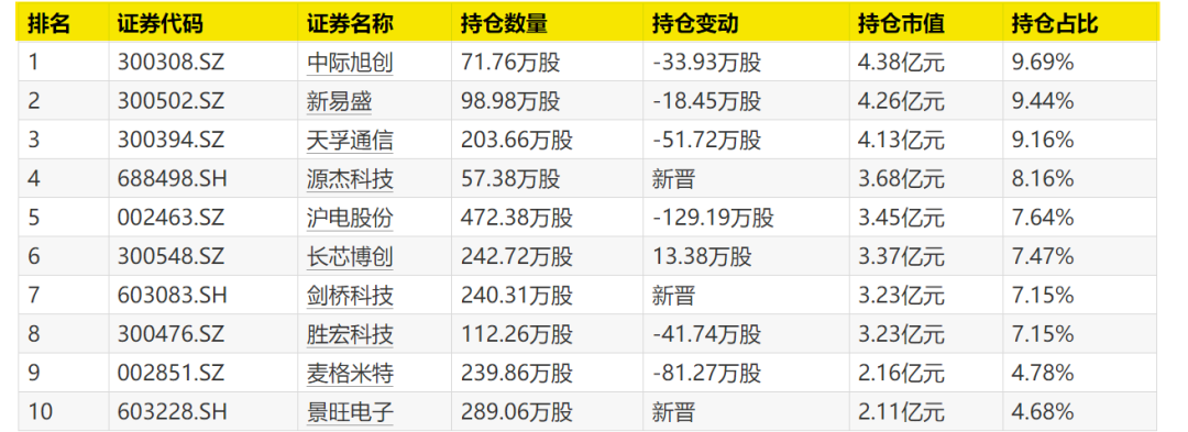 东山精密(002384)、永鼎股份(600105)、长芯博创(300548)、胜宏科技(300476)、麦格米特(002851)新晋十大重仓股。
