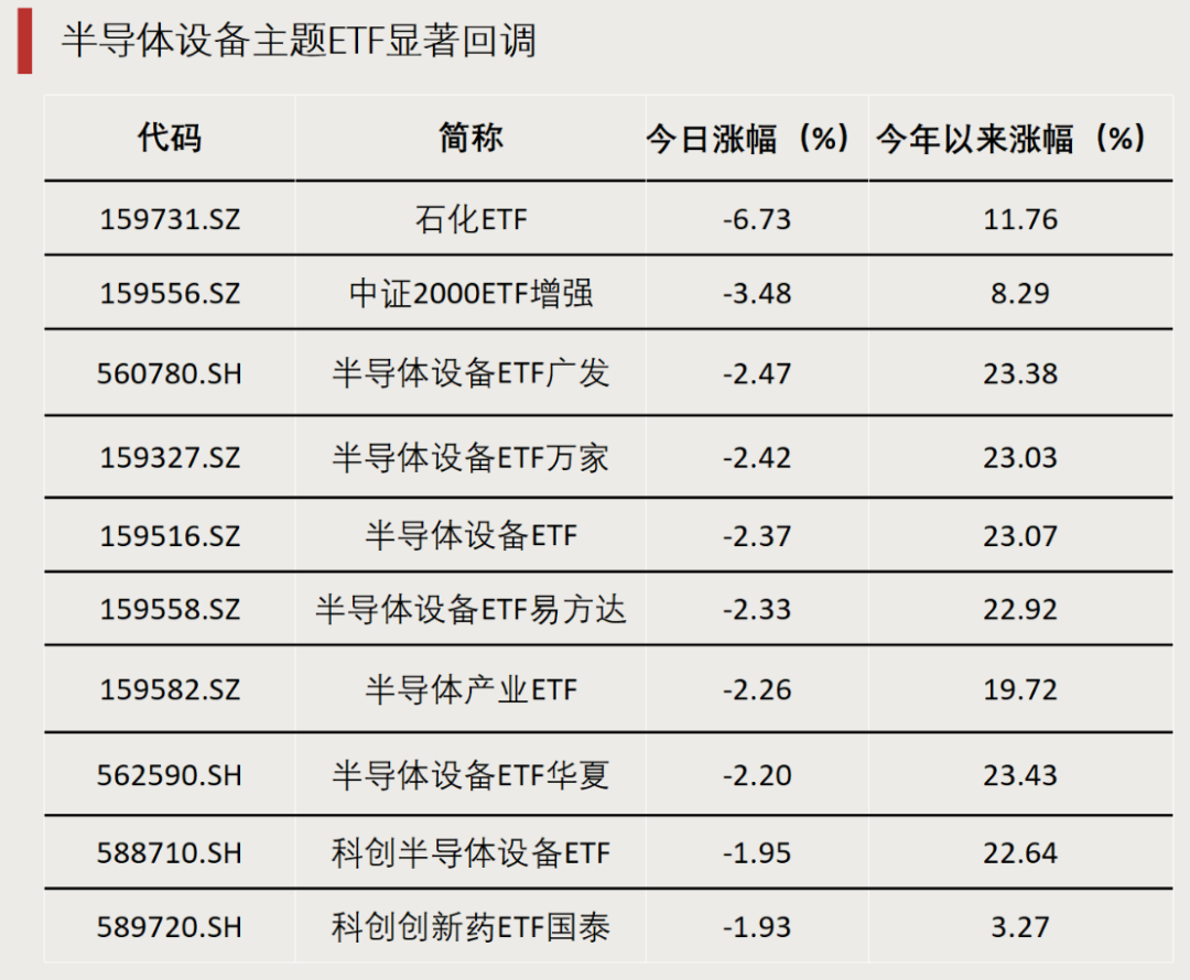 此前较为火热的半导体设备、电网、黄金股等板块今日集体降温,多只跟踪半导体材料设备指数的ETF跌超2%,多只电网、黄金股等主题ETF跌超1%。
