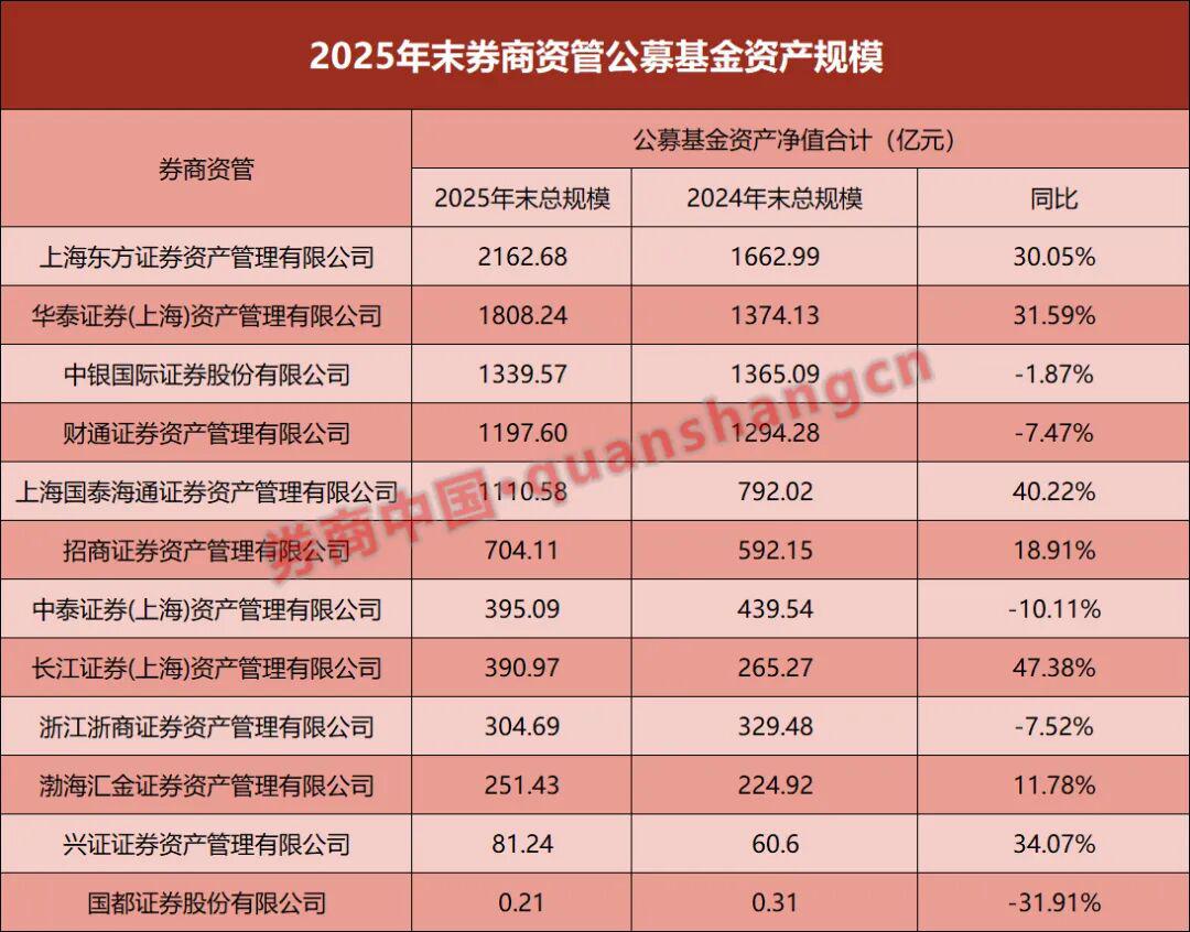 数据显示,2025年,券商资管的公募业务在资本市场交投活跃的背景下稳步增长。其中,东方红资产管理、华泰证券资管的公募产品规模去年双双增长超30%。