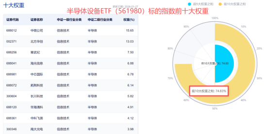 半导体设备ETF(561980)跟踪中证半导,重仓中微公司、北方华创(002371)(002371.SZ)等设备龙头以及晶圆厂龙头中芯国际,芯片设计龙头海光信息(688041.SH)、寒武纪和材料龙头南大光电(300346)(300346.SZ)等,前十大集中度约75%,在同类指数中位居前列。