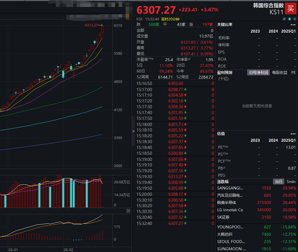 2月26日,韩国股市再创新高。截至当日收盘,韩国综合股价指数涨3.67%,报6307.32点,盘中更是创下6313.27点的历史新高,年初至今涨幅高达49.67%。