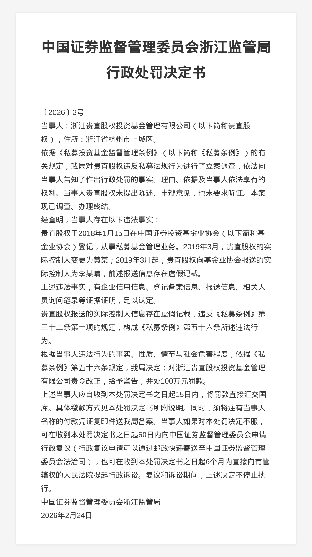 浙江贵直股权投资基金被罚100万,涉报送实控人信息虚假记载