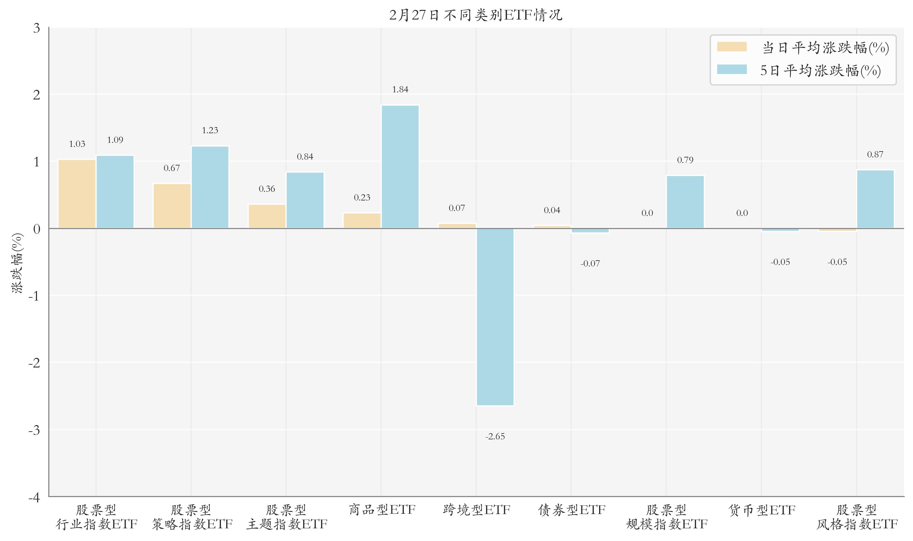 根据ETF基金的规模和涨跌幅计算得出不同分类情况下各类ETF基金的平均涨跌幅。