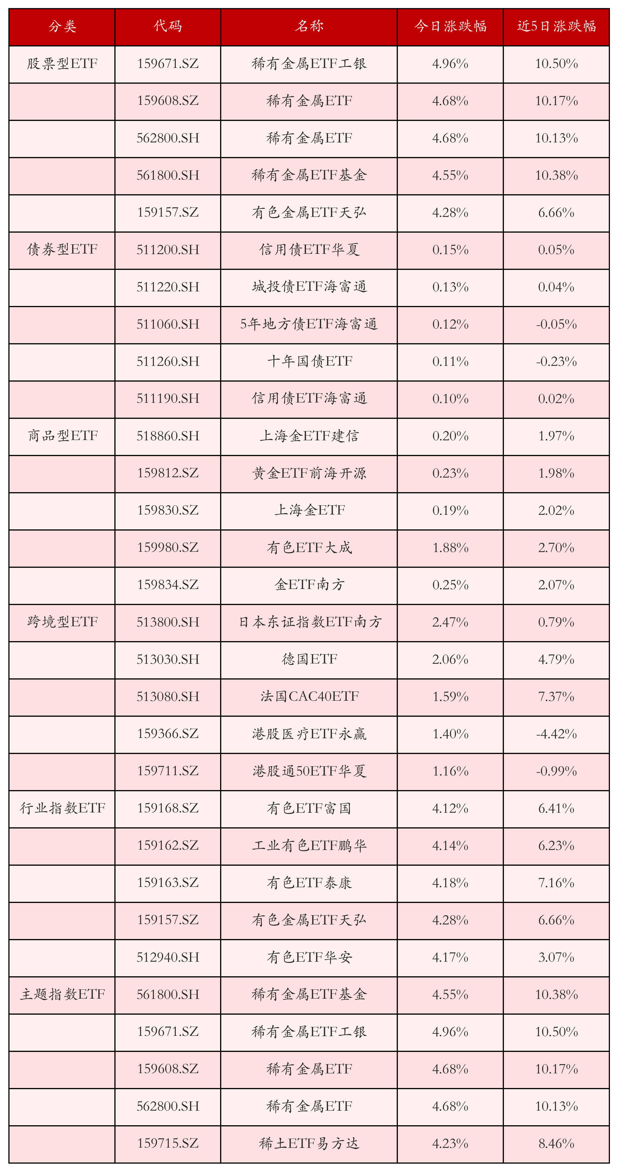 从不同投资种类、行业、主题的ETF产品中找出今日走势行情排名前5的ETF基金,今日涨幅靠前的ETF产品如下表所示。股票型ETF中涨跌幅排名前3位的ETF产品分别为稀有金属ETF工银(159671.SZ)、稀有金属ETF(159608.SZ)和稀有金属ETF(562800.SH),今日收益率分别为4.96%、4.68%和4.68%。