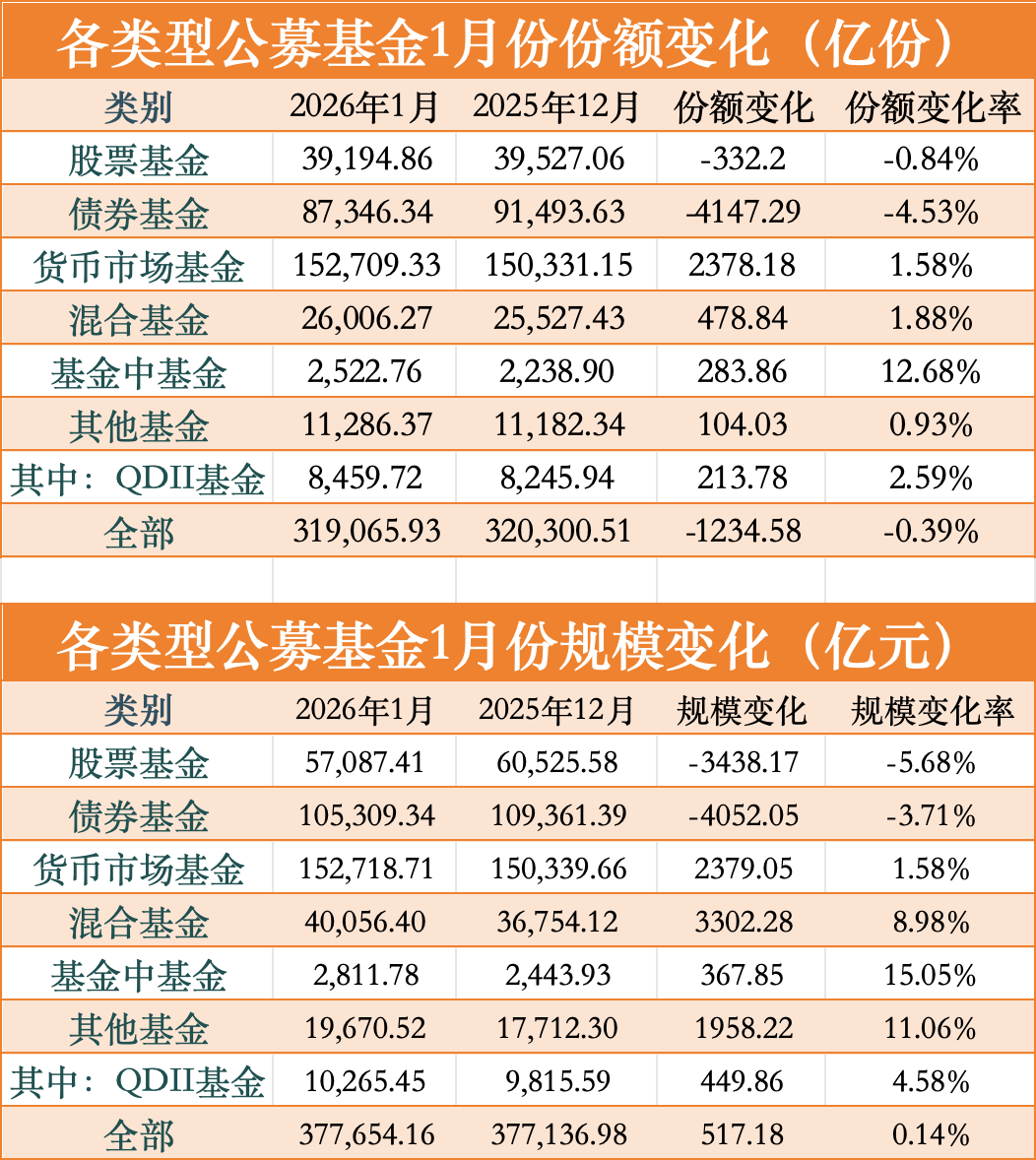 截至今年1月末,公募基金整体份额达到31.91万亿份,相比2025年12月末下降0.39%;公募基金整体规模达到37.77万亿元,环比增长0.14%。在份额出现微幅缩水的情况下,依靠净值增长,规模保持正增长。