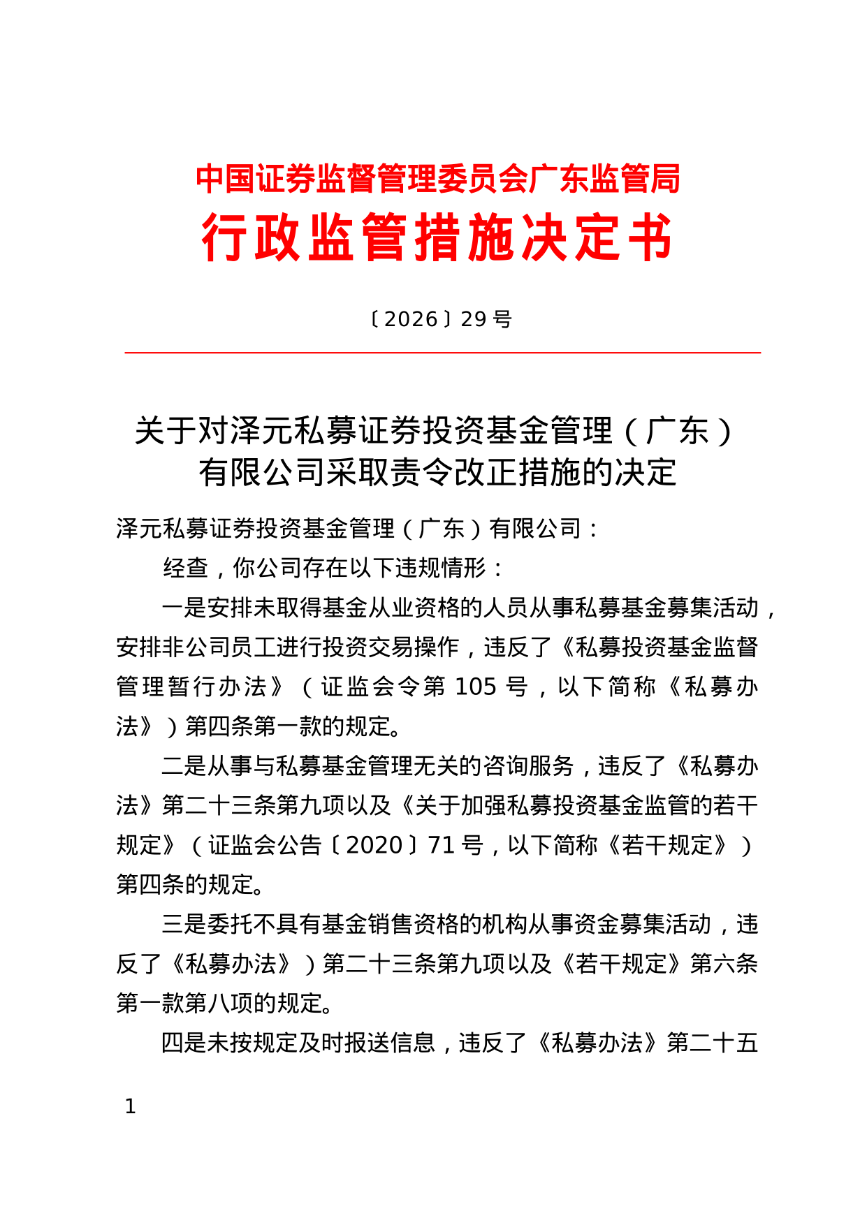 蓝鲸新闻3月3日讯,近日,广东证监局发布了行政监管措施决定书,剑指泽元私募证券投资基金管理(广东)有限公司。