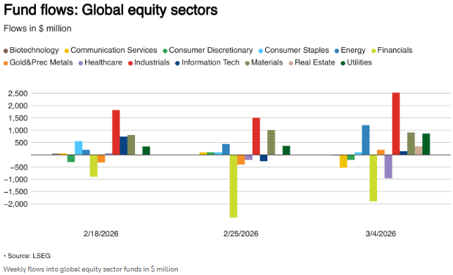 由于美国与以色列同伊朗的冲突不断升级,加剧了通胀担忧并压制了风险偏好,截至3月4日当周,全球投资者八周来首次削减股票基金持仓。