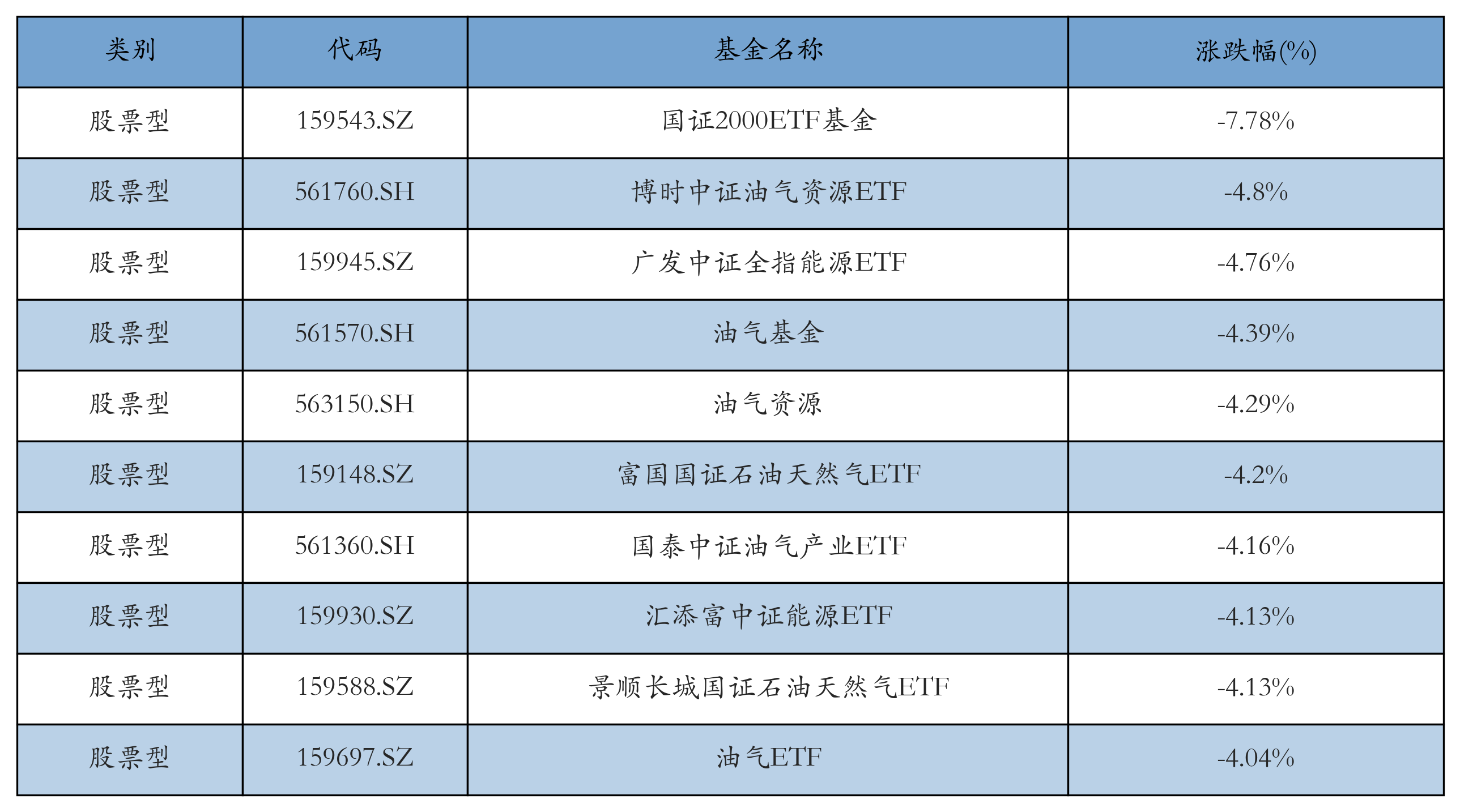 昨日股票型ETF跌幅最大的3只ETF及其收益率分别为:国证2000ETF基金(-7.78%)、博时中证油气资源ETF(-4.8%)、广发中证全指能源ETF(-4.76%)。跌幅前10详情见下表: