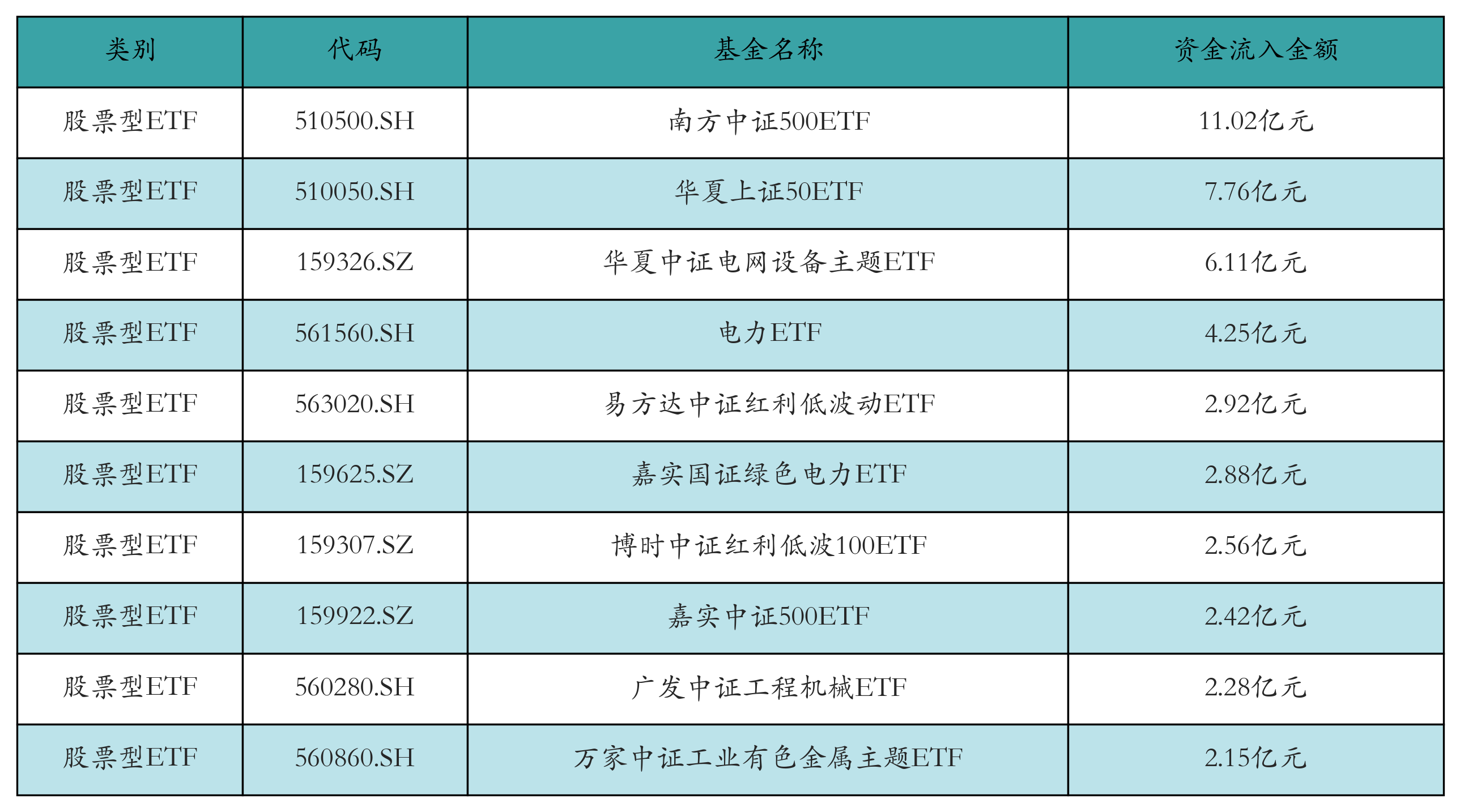 昨日股票型ETF资金流入最多的3只ETF及其流入金额分别为:南方中证500ETF(流入11.02亿元)、华夏上证50ETF(流入7.76亿元)、华夏中证电网设备主题ETF(流入6.11亿元)。资金流入前10详情见下表: