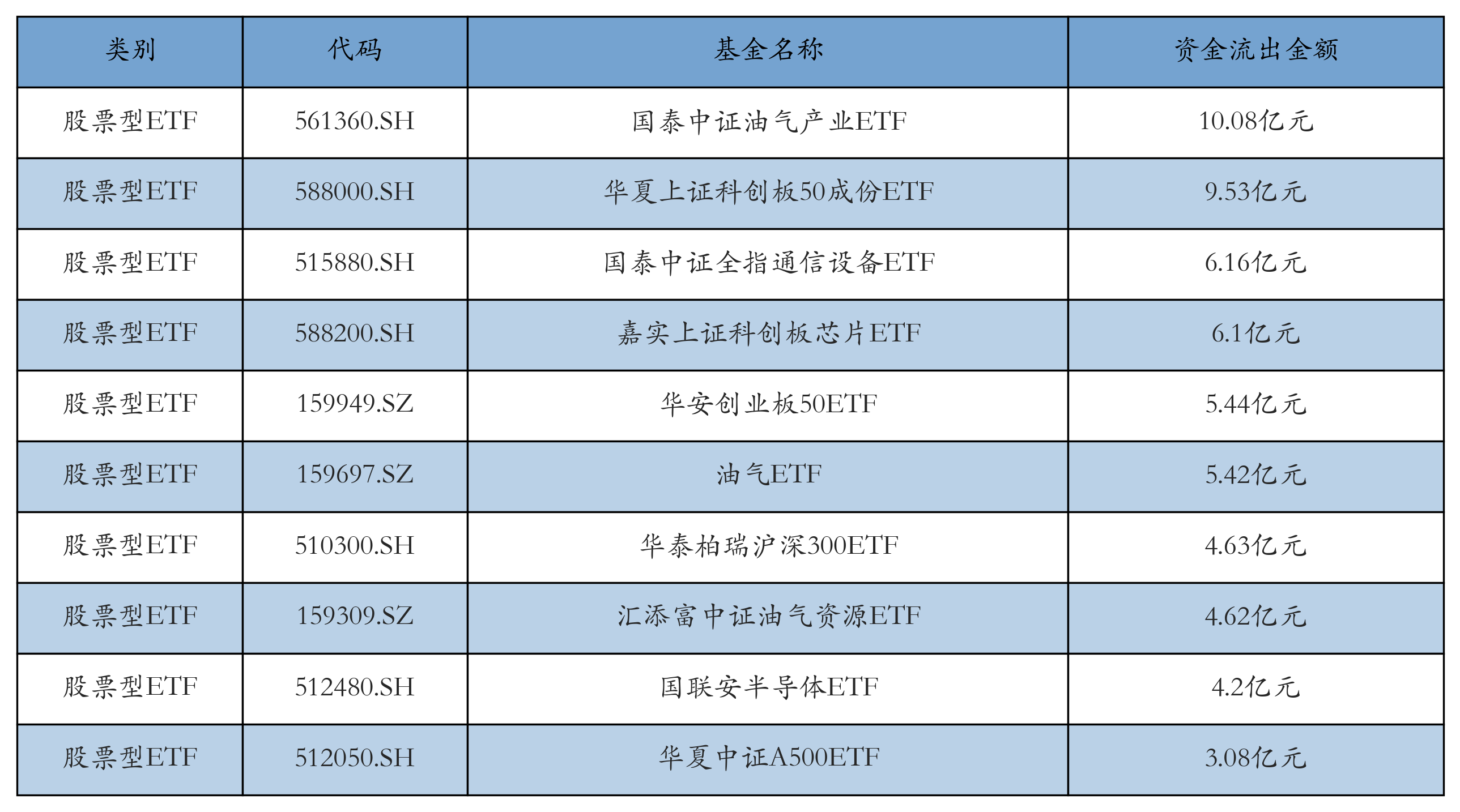 昨日股票型ETF资金流出最多的3只ETF及其流出金额分别为:国泰中证油气产业ETF(流出10.08亿元)、华夏上证科创板50成份ETF(流出9.53亿元)、国泰中证全指通信设备ETF(流出6.16亿元)。资金流出前10详情见下表: