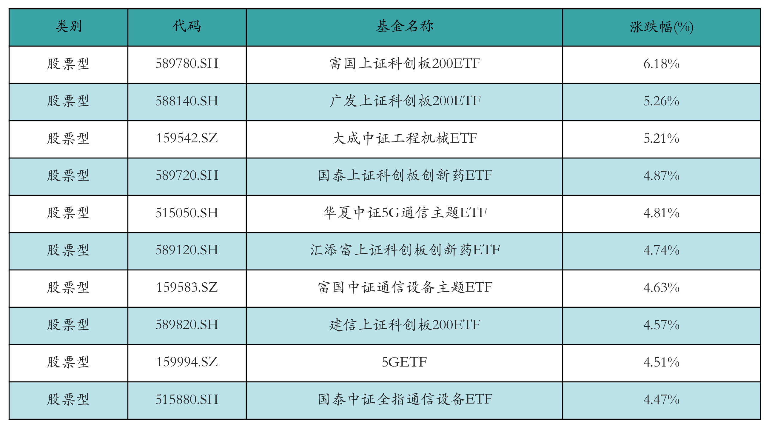 昨日股票型ETF涨幅最高的3只ETF及其收益率分别为:富国上证科创板200ETF(6.18%)、广发上证科创板200ETF(5.26%)、大成中证工程机械ETF(5.21%)。涨幅前10详情见下表: