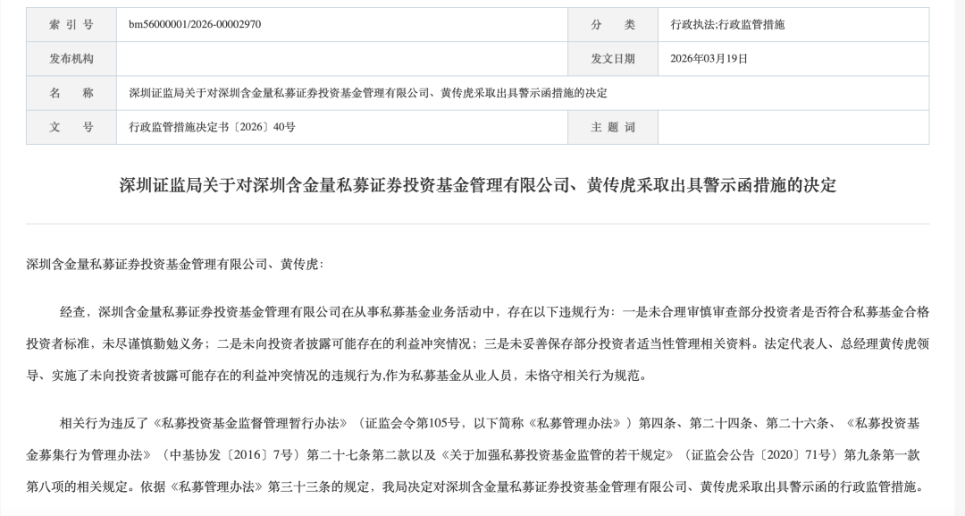 深圳证监局近日也发布行政监管措施决定书称,深圳含金量私募证券投资基金管理有限公司在从事私募基金业务活动中,存在未合理审慎审查部分投资者是否符合私募基金合格投资者标准,未向投资者披露可能存在的利益冲突情况等违规行为。