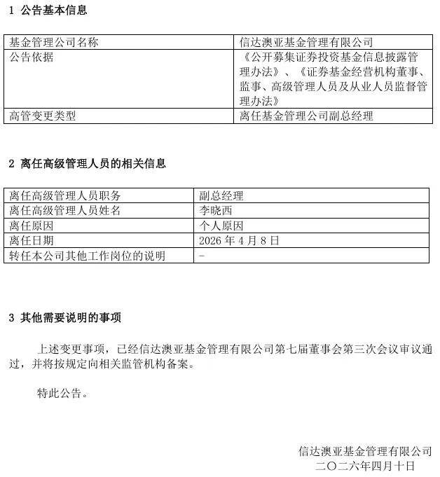 4月10日,信达澳亚基金发布多份人员变更公告,李晓西因个人原因于4月8日离任公司副总经理,且不再转任公司其他工作岗位。同日,李晓西卸任上述两只基金的基金经理职务,分别由何静和孔晓语单独管理。至此,李晓西已无在管基金。