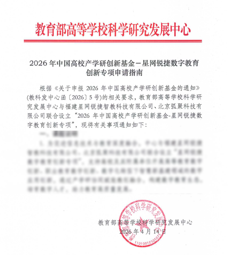为贯彻落实党的二十大和二十届历次全会及全国教育大会精神,积极响应国家“人工智能+教育”行动计划,深化产学研融合,助力教育数字化战略转型,教育部高等学校科学研究发展中心与星网锐捷(002396)旗下福建星网锐捷智教科技有限公司、北京弧聚科技有限公司联合设立2026年中国高校产学研创新基金—星网锐捷数字教育创新专项。通过汇聚企业资源与高校智慧,探索产学研协同发展的长效模式,培育创新型数字人才,共同攻克数字教育前沿课题,促进科技成果转化。