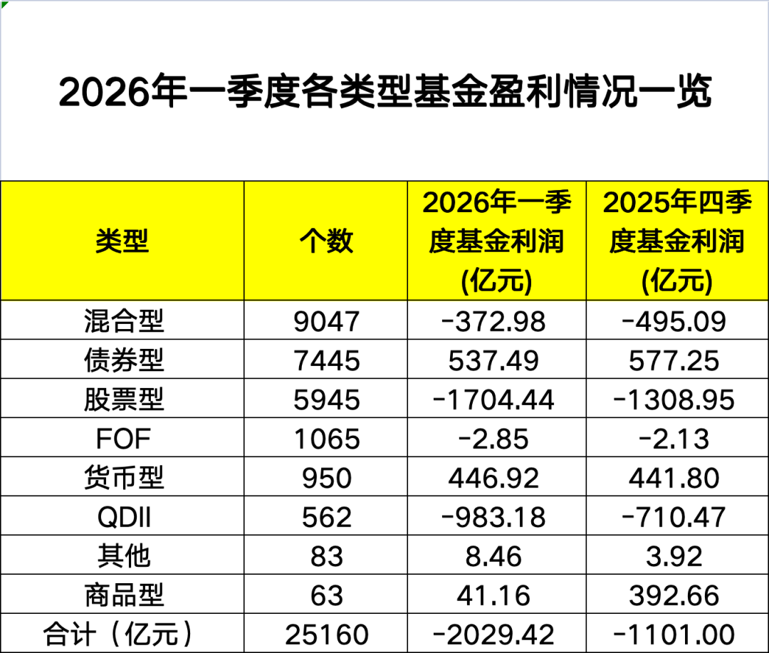 由于一季度市场整体冲高回落、震荡分化,公募基金“赚钱效应”减弱,公募产品整体亏损2029.42亿元,这也是继2025年四季度亏损后,公募的又一个“亏损季”。