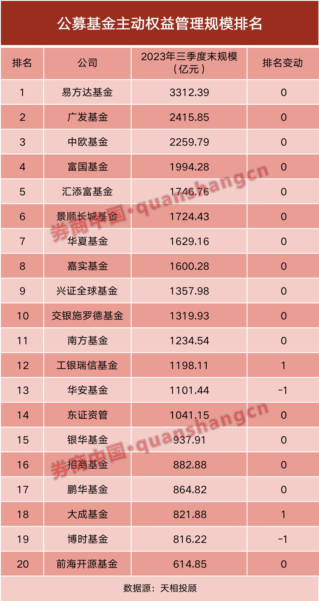 主动权益基金管理规模排名前二十的公司中,仅大成基金的主动权益规模在第三季度出现上涨,延续逆势增长态势。