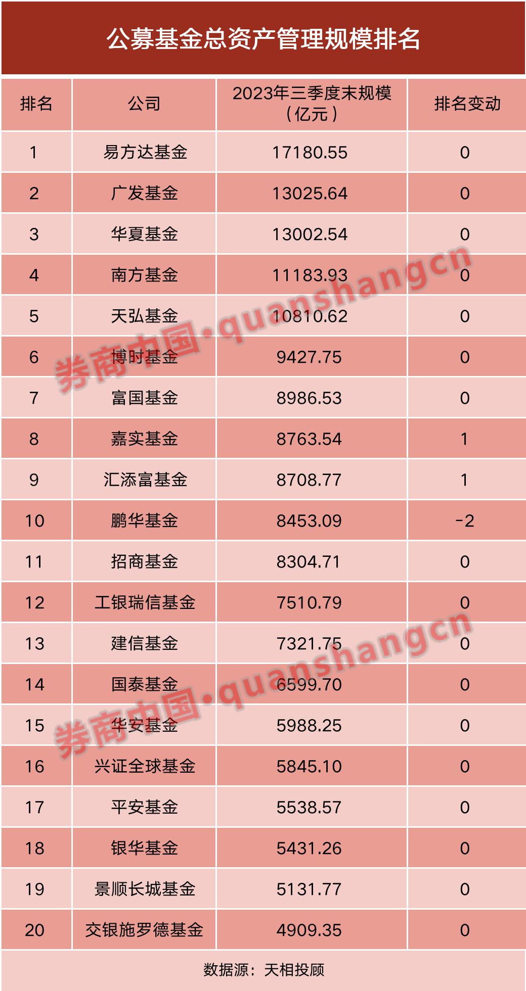 据天相投顾数据,截至2023年三季度末,易方达基金、广发基金、华夏基金、南方基金和天弘基金5家基金公司的资产管理规模(含次新基金规模估算值)均超万亿元。