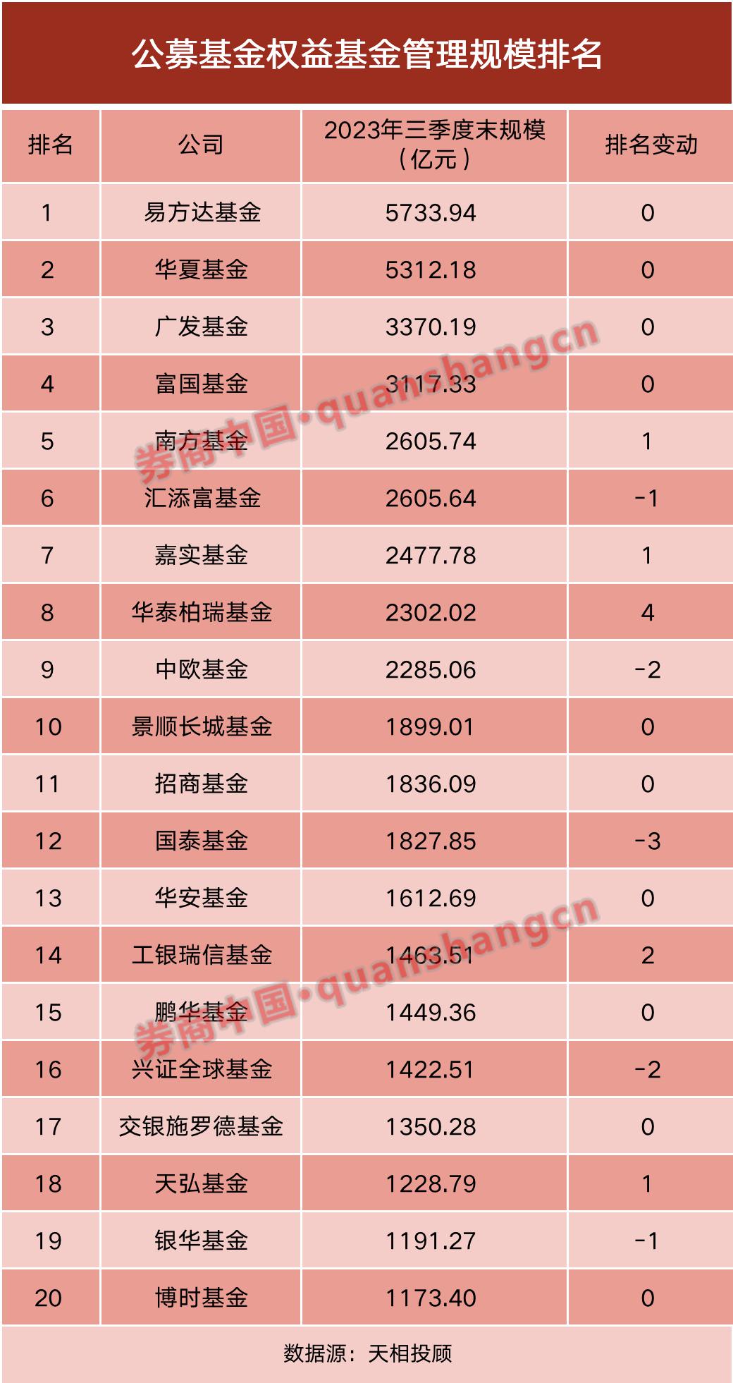 权益基金管理规模排名居前的公司有易方达基金、华夏基金、广发基金、富国基金和南方基金,二季度末规模分别为5733.94亿元、5312.18亿元、3370.19亿元、3117.33亿元和2605.74亿元。