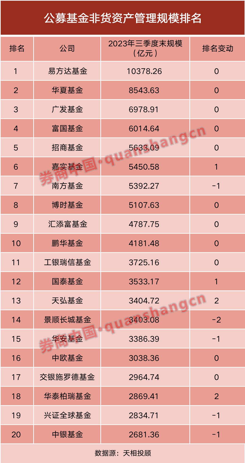 华夏基金、广发基金、富国基金和招商基金分别位列第二至第五位,其中仅华夏基金和招商基金三季度非货资产管理规模实现增长。