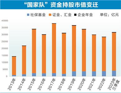 分类来看,截至2023年三季度末,证金、汇金及旗下资管计划持股市值达2.73万亿元,与二季度末基本持平,较2021年增超1200亿元;社保基金(含养老金)持股市值接近4140亿元,较二季度末略有下降。将时间拉长来看,2023年三季度末社保基金、企业年金的持股市值均达到2013年以来最高峰。