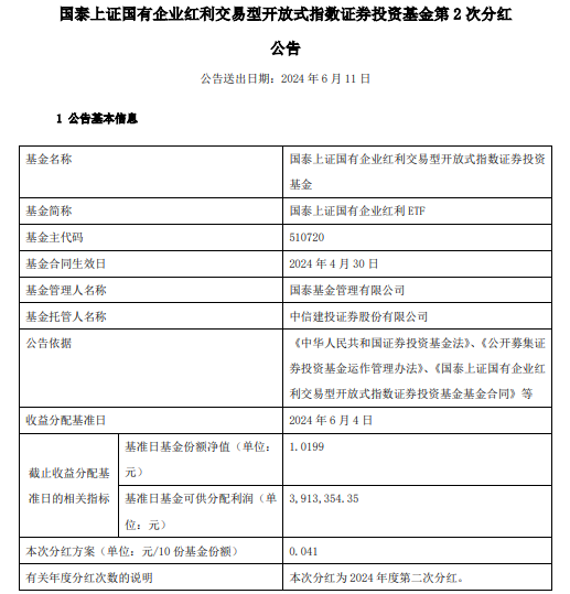 自2024年5月15日上市后,红利国企ETF已于当月完成了首次分红,分红方案为0.031元/10份基金份额。目前又公告了第二次分红,本次分红方案为0.041元/10份基金份额。
