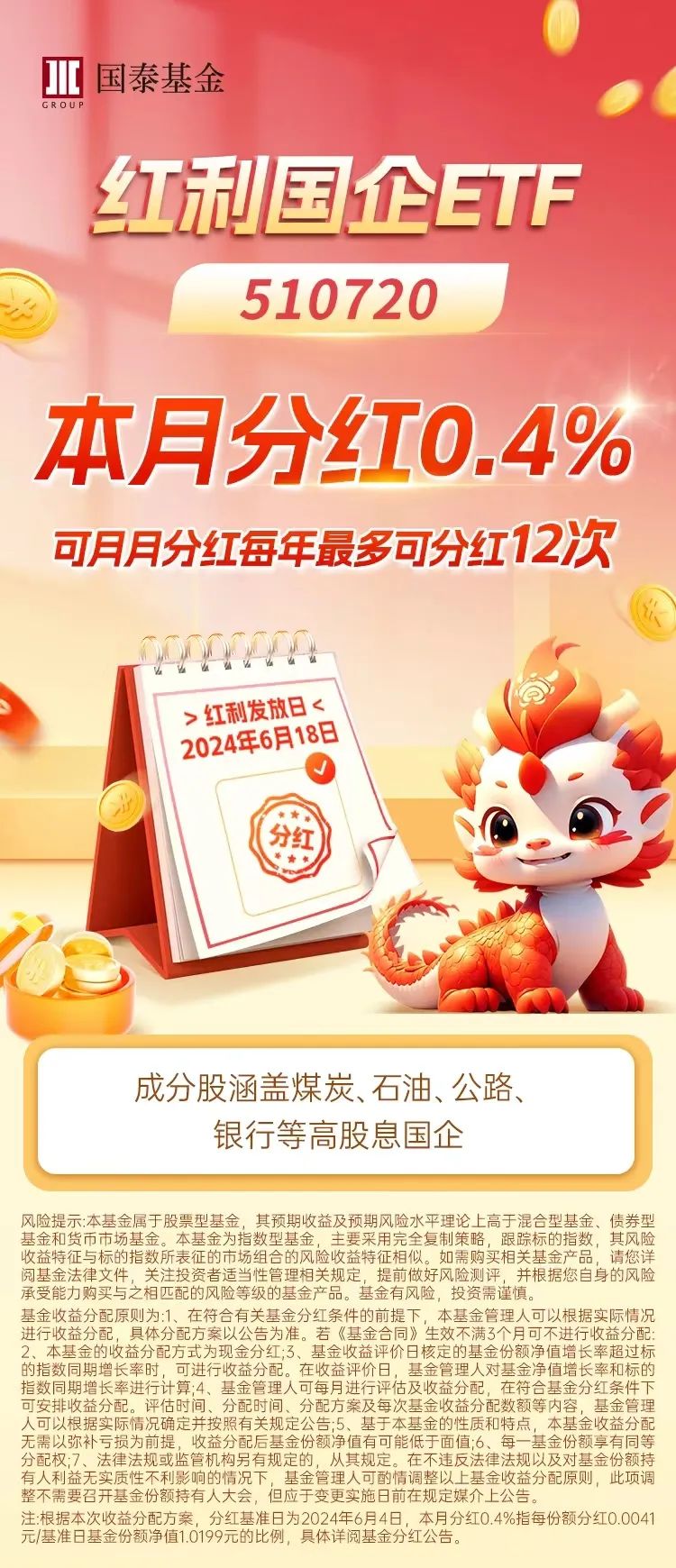 6月11日,红利国企ETF(510720)发布第二次分红公告,本次分红方案为0.041元/10份基金份额。权益登记日为6月12日,现金红利发放日为6月18日。这也是自5月24日首次分红之后,红利国企ETF上市后的连续第二个月分红。