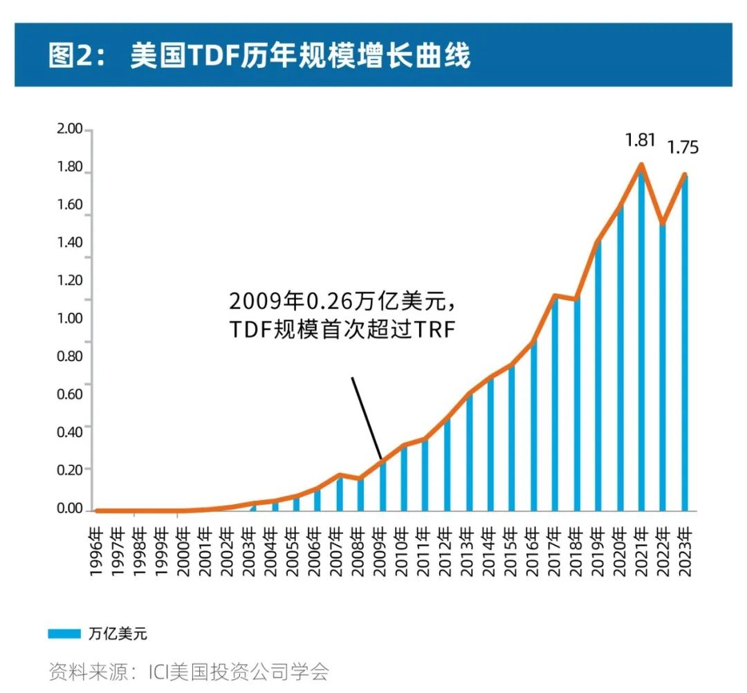 经过约30年的发展,TDF逐步占据主导地位。2000年左右,TDF在美国养老产品中占比仅有20%,2009年占比已超过50%;而在2021年后,TDF在美国养老金产品中的份额稳定在80%以上。2023年底,其资产规模达到1.7万亿美元,约合人民币12.7万亿元,比20年前增长70倍(数据来源:ICI 美国投资公司学会)。