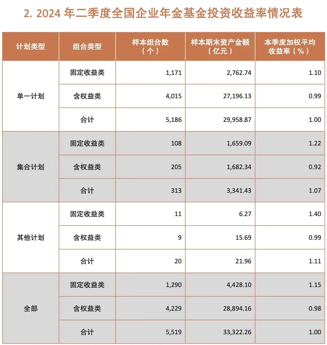 分计划类型看,单一计划中,固定收益类组合、含权益类组合期末资产金额分别为2762.74亿元和27196.13亿元,加权平均收益率分别为1.1%和0.99%;
